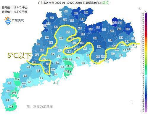 10日早晨最低气温:清远南部、广州北部、惠州南部、江门东北部、梅州北部、茂名北部较9日早晨下降了1~2℃,其余大部市县较9日早晨回升了1~2℃,最低气温具体分布:粤北大部、肇庆大部、云浮大部、广州增城、惠州龙门、汕尾海丰、揭阳揭西和潮州介于0~5℃,其中高海拔山区-4~0℃,有霜冻或冰冻,珠三角南部沿海和粤西沿海介于9~11℃,其余大部市县6~11℃,其中梅州平远录得全省最低气温-0.5℃。 详情>>>